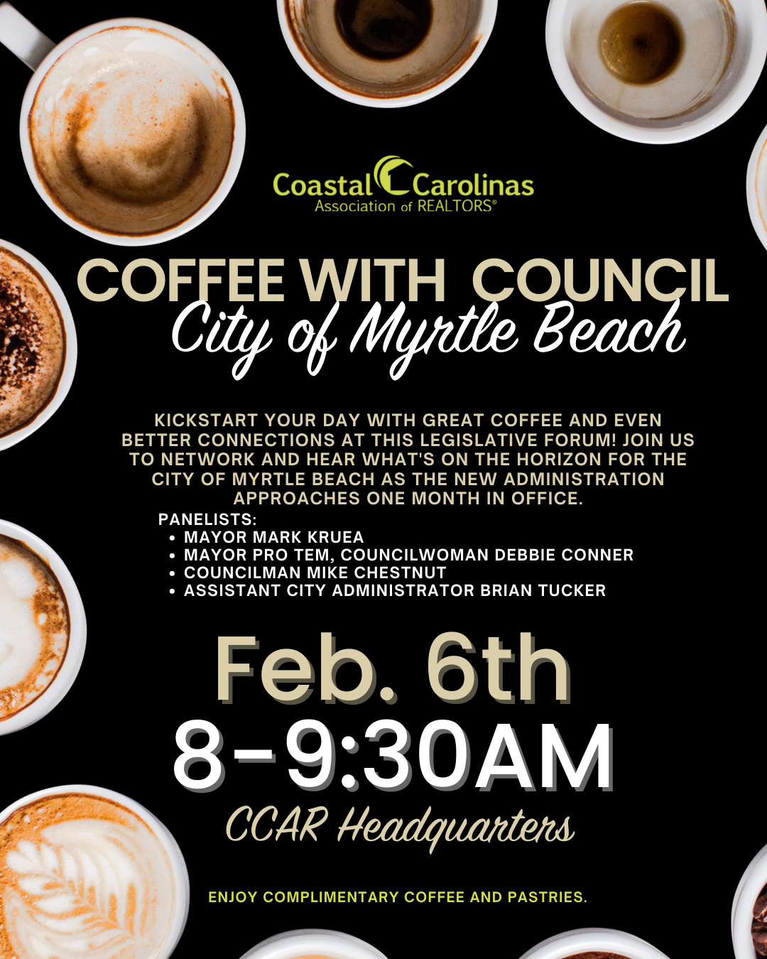 Kickstart your day with great coffee and even better connections at this legislative forum! Join us to network and hear what's on the horizon for the City of Myrtle Beach as the new administration approaches one month in office.