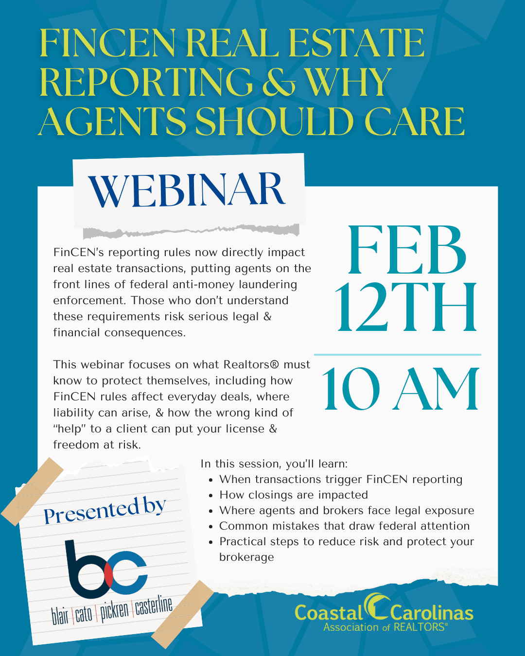 This webinar cuts through the noise and focuses on what Realtors must know to protect themselves. We’ll explain how FinCEN rules intersect with everyday transactions, where agents can unintentionally create liability, and why “helping the client” the wrong way can put your license – and freedom – at risk.