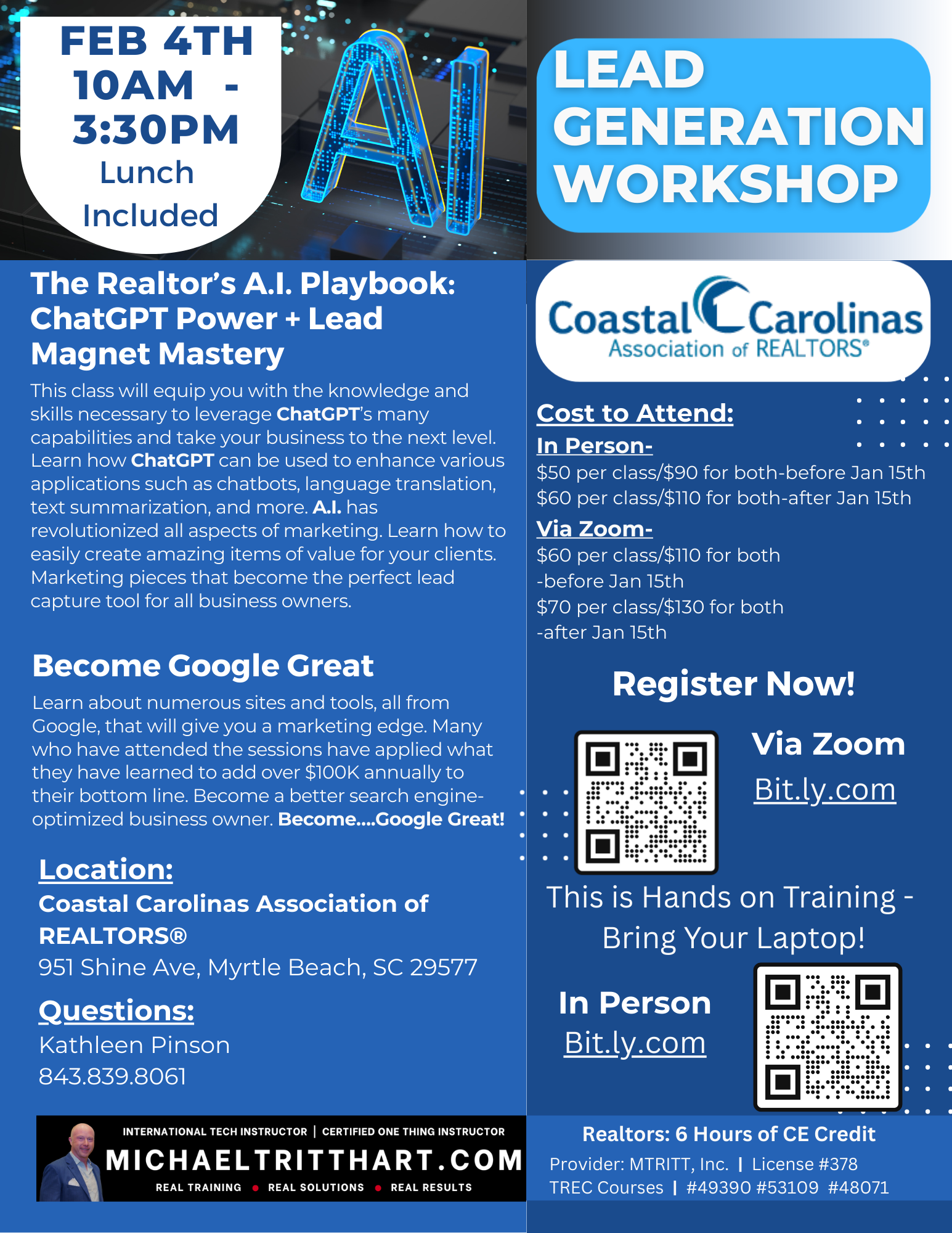 is an immersive, two-hour, hands-on workshop designed to equip real estate professionals with the tools and knowledge to build credibility, deepen client trust, and grow their business using artificial intelligence. Through two focused sessions—ChatGPT for Real Estate and Lead Magnet Mastery with A.I.—agents will learn how to use AI to create authentic, client-centered content that demonstrates expertise and reinforces trust at every stage of the consumer journey. Participants will actively build real-world materials such as marketing scripts, lead magnets, and eBooks that both educate and convert. Attendees are encouraged to bring their laptop or tablet and follow along live as they develop practical, AI-powered strategies that can be implemented immediately to enhance their professionalism and market influence. This isn’t just about learning AI—it’s about leveraging it to create transparency, consistency, and genuine consumer confidence in an increasingly digital marketplace.